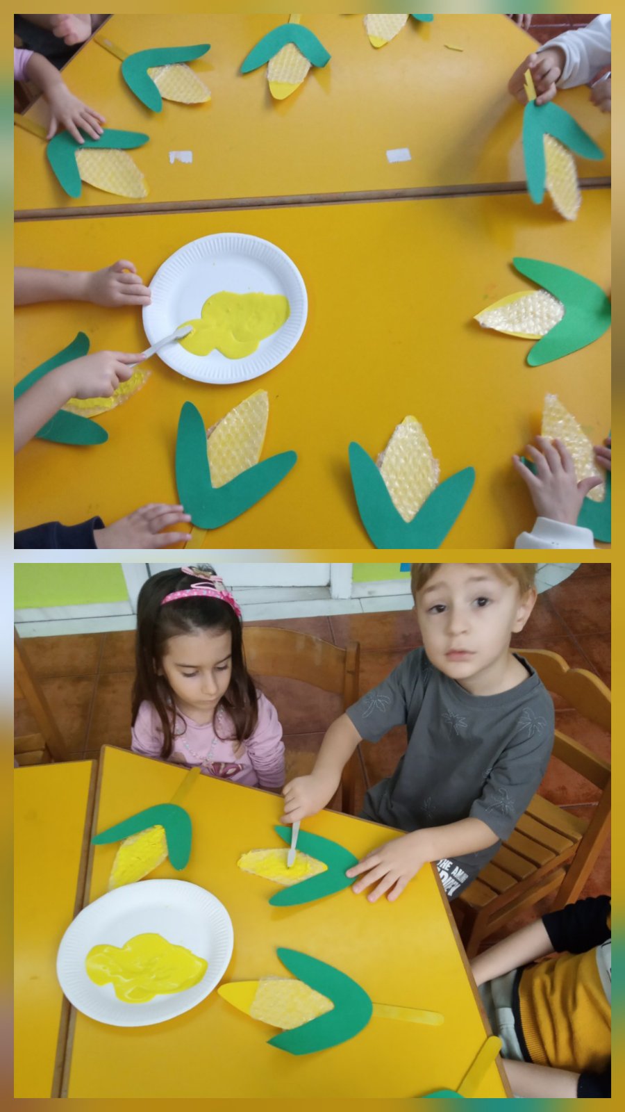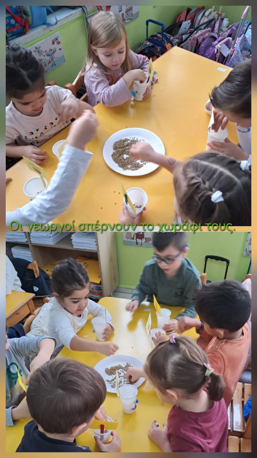 Με αυτό το τραγουδάκι ξεκινήσαμε την εβδομάδα μας που είχε ως θέμα τη Σπορά. Αφού μάθαμε μέσα από παραμύθια και ιστορίες τί χρειάζεται ένα σποράκι για να μεγαλώσει, αποφασίσαμε να γίνουμε και εμείς αγρότες και να φυτέψουμε τις δικές μας φακές. Τα παιδιά ενθουσιάστηκαν με το γεγονός ότι θα έπρεπε να φροντίζουν το δικό τους φυτό! Στη συνέχεια μάθαμε για τη διαδικασία της σποράς στα παλιά χρόνια και τη συγκρίναμε με το σήμερα. Τέλος, μιλήσαμε για το κύκλο του ψωμιού, πως δηλαδή από το σιτάρι, φτάνουμε να παίρνουμε στα χέρια μας το ζεστό και όμορφο ψωμάκι!