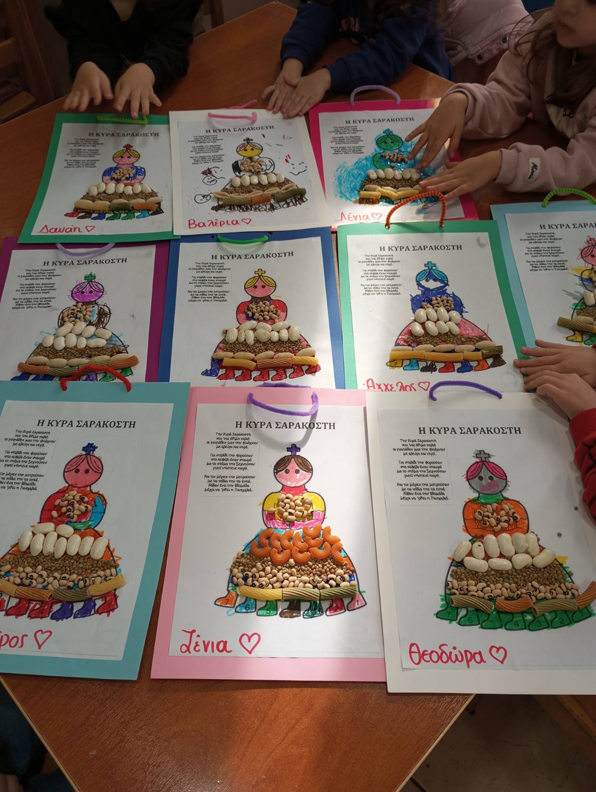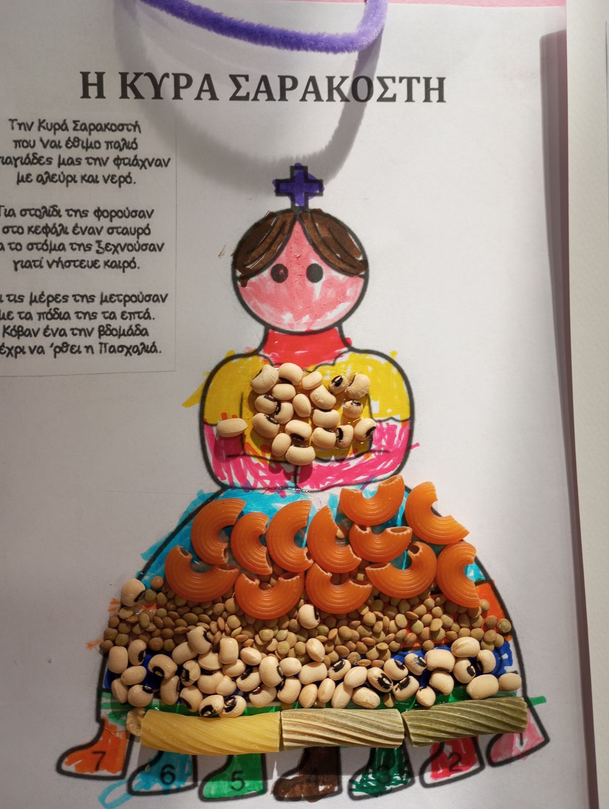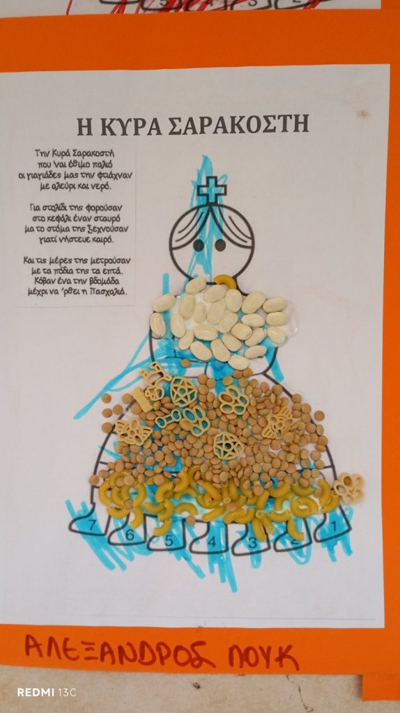 Η κυρά Σαρακοστή είναι ένα παλιό και πολύ όμορφο έθιμο που αξίζει να το θυμόμαστε και να το κάνουμε κάθε χρόνο με τα παιδιά μας. Είναι ένα ημερολόγιο που φτιάχνετε είτε από χαρτί είτε από ζυμάρι . Είναι μία κοπέλα που δεν έχει στόμα γιατί νηστεύει και για να μην πολυλογεί, τα χέρια της είναι πλεγμένα το ένα με το άλλο γιατί προσεύχεται και έχει 7 πόδια που συμβολίζουν τις επτά εβδομάδες, δηλαδή την περίοδο νηστείας μέχρι το Πάσχα. Κάθε Σάββατο κόβουμε ένα πόδι από την Σαρακοστή. Το τελευταίο το κόβουμε το μεγάλο Σάββατο και σε κάποιες περιοχές όπως στη Χίο το κρύβουν μέσα σε ένα ξερό σύκο και όποιος το βρει του φέρνει γούρι.