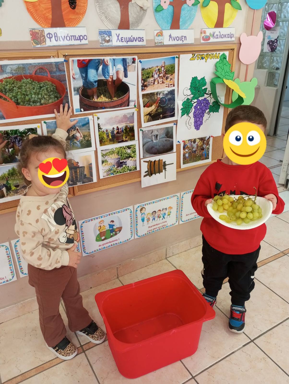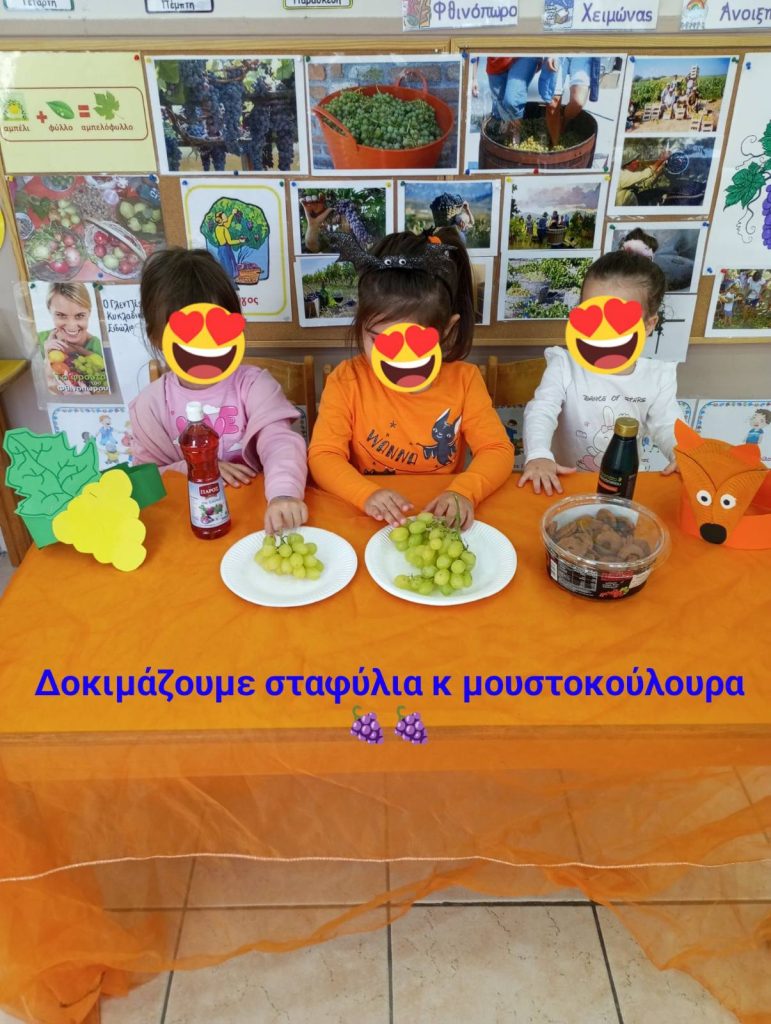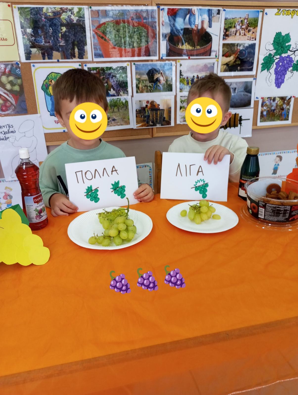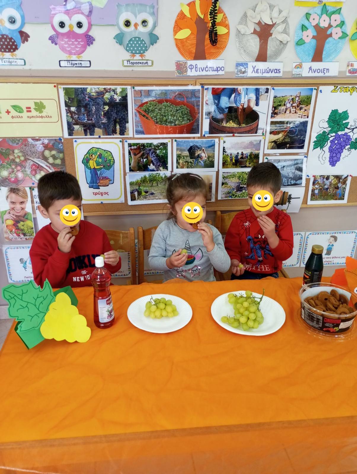 Τα μικράκια του παιδικού σταθμού μίλησαν για τη διαδικασία του τρύγου.Δοκίμασαν σταφύλι ,μουστοκούλουρα και έκαναν κατασκευούλες με θέμα το σταφύλι.