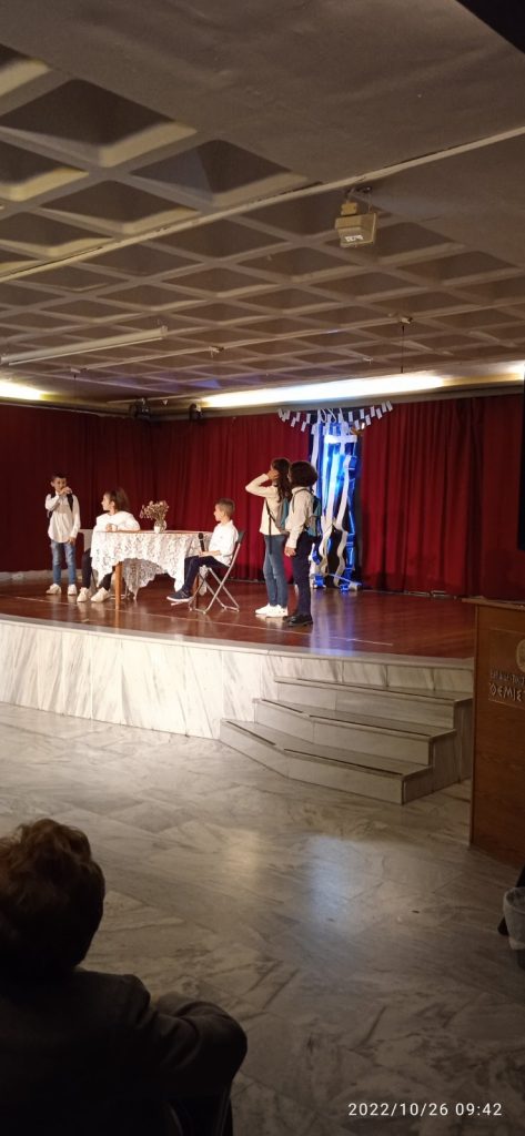 Την Τετάρτη 26 Οκτωβρίου 2022 οι μαθητές της Δ’ Δημοτικού γιόρτασαν την επέτειο της 28ης Οκτωβρίου στο θέατρο “Κάρολος Κουν” του σχολείου μας. Τα παιδιά τίμησαν τους ήρωες του 1940 παρουσιάζοντας ποιήματα και επετειακά τραγούδια για την 28η Οκτωβρίου. Τους αξίζουν πολλά συγχαρητήρια!