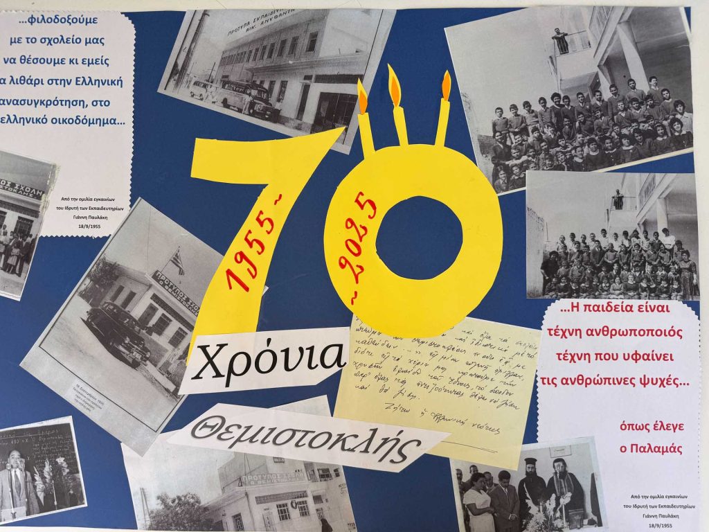 Σήμερα 18/09/2025, 70 χρόνια μετά, γιορτάζουμε τα γενέθλια του «ΘΕΜΙΣΤΟΚΛΗ» στην αυλή του σχολείου μας σε μια ατμόσφαιρα συγκίνησης χαράς και ικανοποίησης! Οι στόχοι που έθεσαν οι ιδρυτές του σχολείου επετεύχθησαν! Και έγινε ο «ΘΕΜΙΣΤΟΚΛΗΣ» το σχολείο που έθεσε ένα λιθάρι στο ελληνικό οικοδόμημα της Παιδείας. Το σχολείο που έγινε φάρος ΓΝΩΣΗΣ-ΑΡΕΤΗΣ-ΠΟΛΙΤΙΣΜΟΥ!